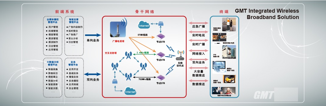 2、Second Solution : make use of DTMB push ability and the advantage of radio and television network 700M "golden band" wireless broadband communication technology, build coverage area, local area and wide area, and support broadcast, multicast, unicast, and interaction. The scheme can be applied to the urban network architecture, and it can be applied to the wireless interconnection service in high-density pedestrian areas such as large venues, rail transit and industrial parks.