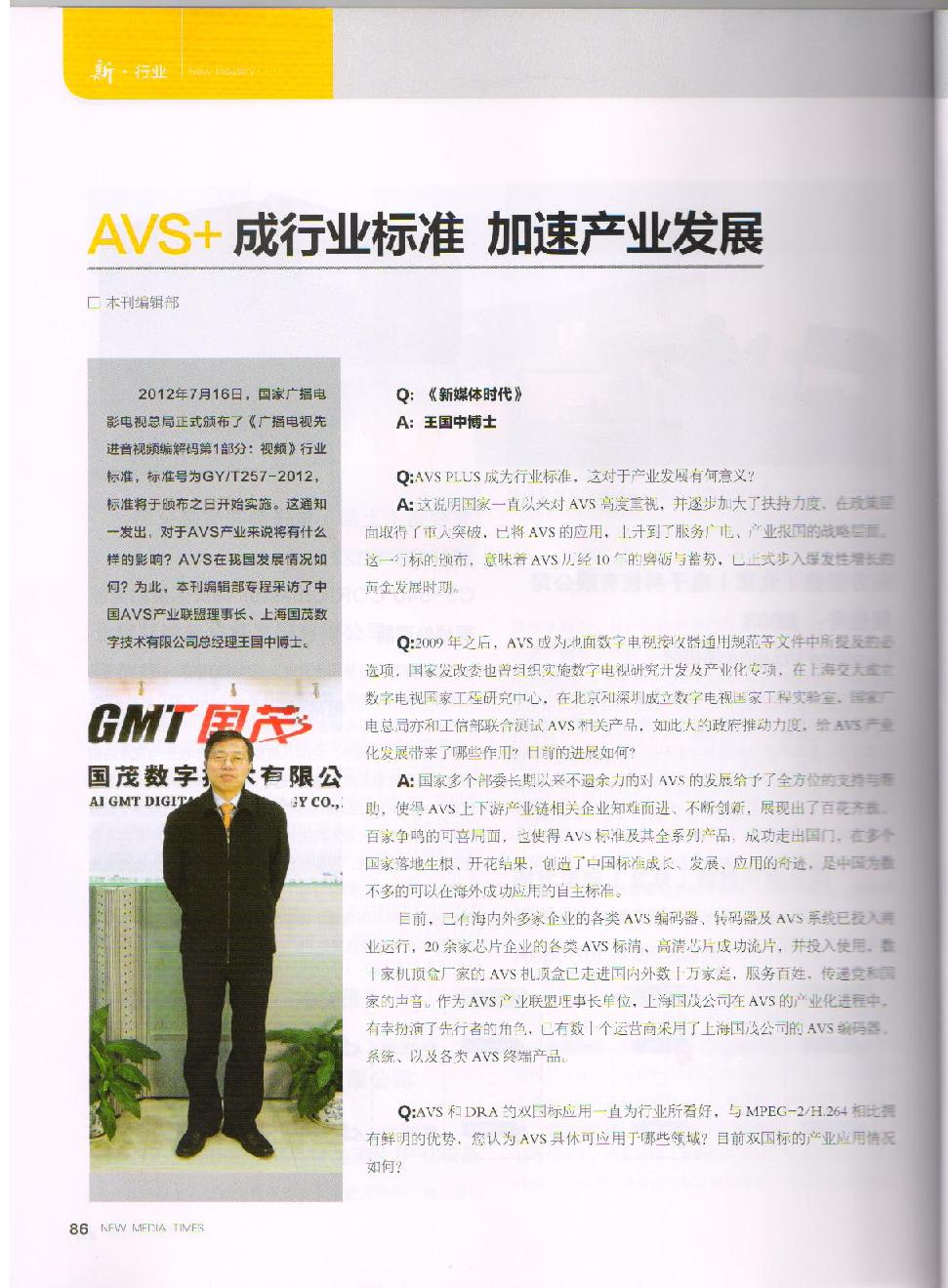 2012年8月24日,國家廣播電影電視總局科技司和工業(yè)和信息化部電子信息司在北京共同主辦了“《廣播電視先進音視頻編解碼 第1部分:視頻》(AVS+)標準發(fā)布暨宣貫會”,共同推進該標準的應用和產業(yè)