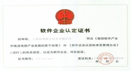 經過專家評審、網上公示,上海國茂數字技術有限公司獲得上海市經濟和信息化委員會頒發的"軟件企業認定證書",證書編號:滬R-2011-0096.