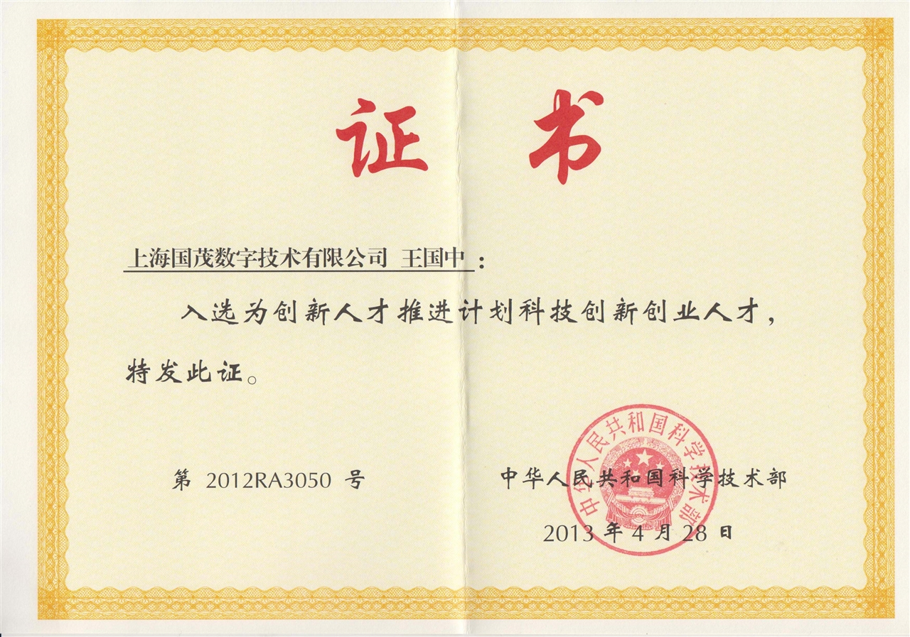 近日,上海國茂數字技術有限公司董事長王國中先生獲得中華人民共和國科學技術部頒發的創新人才推進計劃科技創新創業人才入選證書。 國家創新人才推進計劃旨在培養和造就一批具有世界