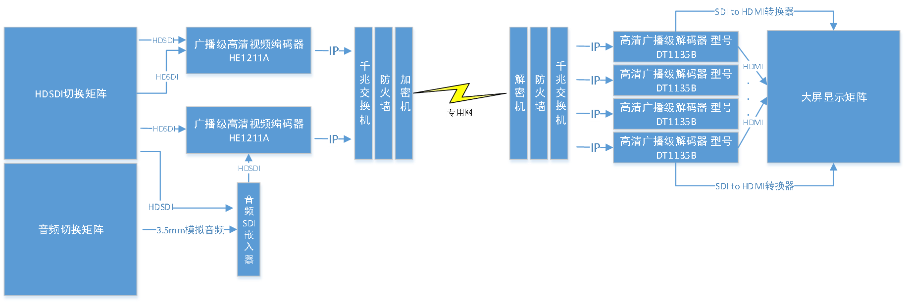 方案包含超高穩(wěn)定視頻圖像編碼器,IP商用/軍用加密解密網關,運營商級別加密傳輸鏈路,超高穩(wěn)定專業(yè)解碼器。通過SDI視頻矩陣選擇所需要的安全傳輸的圖像視頻結合音頻導入至圖傳設備,根據帶寬的需求設置超低帶寬,高清最低可以降至256Kbps視頻圖像。通過IP輸出至IP加密網關,所有數據加密后再通過運營商安全專線傳輸至遠程所需要實時觀測視頻的遠端。